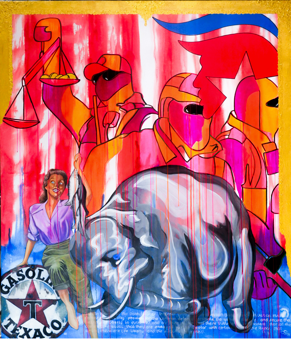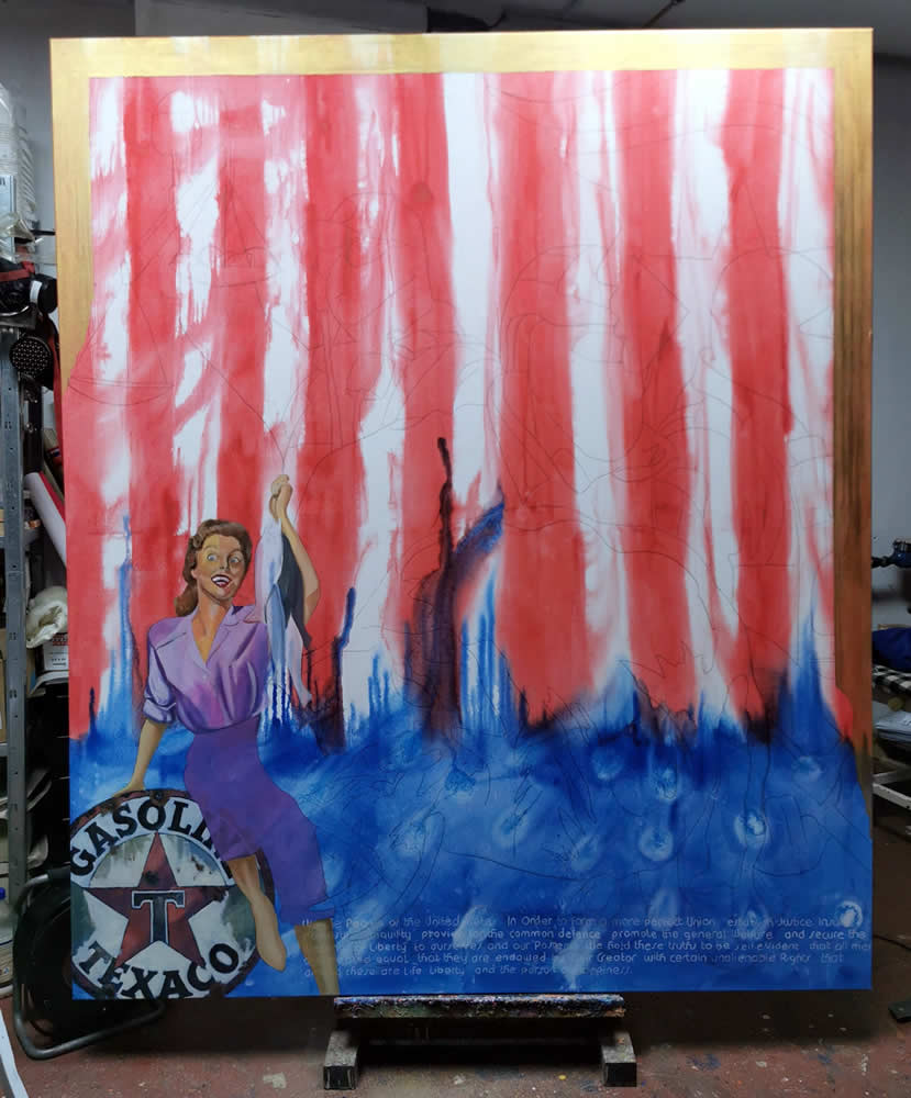 Das alte Texaco-Schild links unten und eine Amerikanerin aus einer alten Werbung darauf- Neben ihr im Fußbereich der Leinwand Auszüge aus der Amerikanischen Unabhängigkeitserklärung. Der Goldrahmen und andere Elemente sind schon angedeutet.