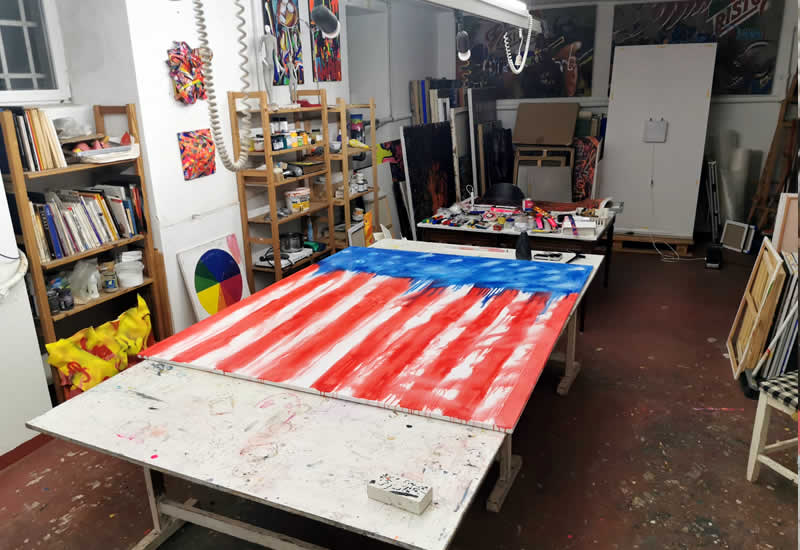 Die im Hintergrund aufgelösten Stars and Stripes verweisen auf eine kollektive Erinnerung, deren Konturen zunehmend verschwimmen. Tropfende Farbschichten und harte Kontraste erzeugen eine Ästhetik des Zerfalls, in der sich Bild und Bedeutung gleichermaßen verflüssigen.